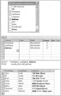 6. Отметьте поля FirstName, LastName и Address в таблице tblCustomer. По мере выбора полей для создания запроса будут изменяться панели полей и запросов SQL.