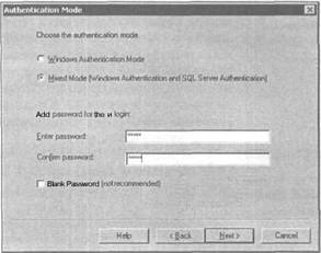 Для рабочего варианта SQL Server в диалоговом окне Authentication Mode (Режим аутентификации), которое показано на рис. 3.3, по умолчанию предлагается режим Windows Authentication Mode (Режим аутентификации Windows). При этом используются преимущества системы обеспечения безопасности Windows NT/2000. При попытке подключения к SQL Server для аутентификации пользователя используется его учетная запись, если он (или его группа пользователей) имеют право доступа к SQL Server. В некоторых ситуациях можно использовать режим Mixed Mode (Смешанный режим), в котором помимо аутентификации в операционной системе Windows пользователь должен пройти процедуру аутентификации SQL Server. Для этого в SQL Server нужно создать учетную запись, которая будет проверяться при попытке подключения к SQL Server. Основным преимуществом этого режима является то, что при этом не требуется устанавливать доверительное соединение между сервером и рабочей станцией, что особенно удобно при подключении клиентов из операционной системы UNIX или Web-клиентов. Однако для реализации этого режима требуются дополнительные действия по обслуживанию двойного набора учетных записей (операционной системы Windows и сервера баз данных SQL Server).