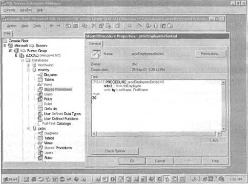2. В диалоговом окне Query введите имя хранимой процедуры, которую нужно запустить. Например, для запуска хранимой процедуры, описанной в предыдущем разделе, введите procEmployeesSorted.