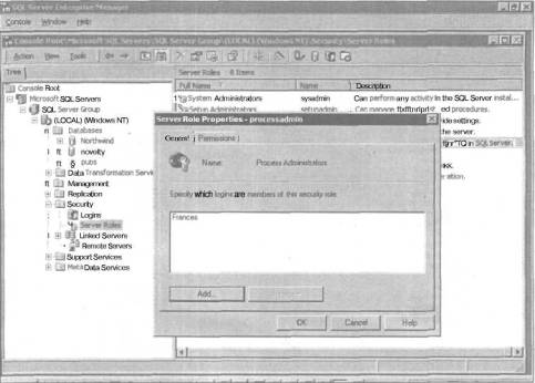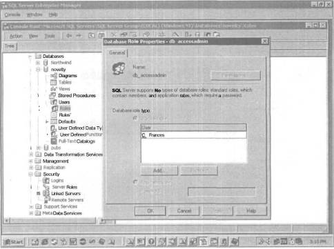В SQL Server 2000, помимо предварительно заданных ролей базы данных, предусмотрено использование определенных пользователем ролей базы данных. Эти роли позволяют настроить способ доступа к данным и выполняемым операциям с базой данных (на этом этапе станет активной кнопка Permissions). Более информацию о ролях базы данных можно найти в справочных руководствах SQL Server Books Online.