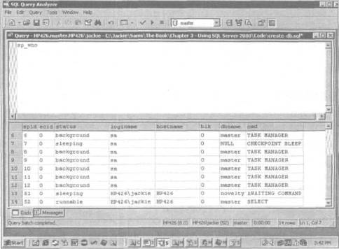 Для того чтобы определить пользователей, подключенных к базе данных, можно использовать хранимую процедуру sp_who. При выполнении эта процедура возвращает список пользователей, которые в настоящий момент подключены к базе данных (рис. 3.27).