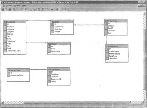 Разработчик базы данных для компании Jones Novelties Incorporated решил применить этот подход для создания корпоративной базы данных. Созданный им сценарий позволяет просто инсталлировать объекты базы данных на компьютере, на котором она даже не определена. Иначе говоря, сценарий выполняет все необходимые действия для создания и инсталляции базы данных и ее объектов на совершенно "пустом" компьютере, что обычно требуется при инсталляции системы на новом рабочем месте. На рис. 3.28 показана схема базы данных Novelty в диалоговом окне программы SQL Server Enterprise Manager.