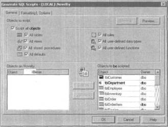 Не забудьте установить во вкладке Formatting флажок Include descriptive headers in the script files, потому что он приводит к автоматическому созданию строки заголовка с указанием времени и даты генерации сценария. Это очень полезное усовершенствование позволит вам впоследствии легко определить самую последнюю (или наиболее правильную) версию сценария.