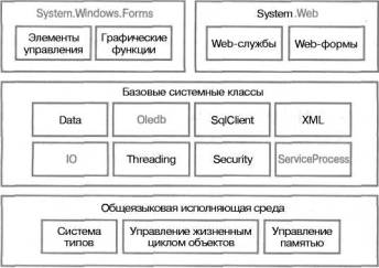 На этом наиболее высоком уровне происходит дифференциация, или разделение, выполняемых функций, которые разработчики могут использовать в разных типах приложений. Он содержит классы и элементы управления для создания (классических) приложений Windows на основе форм (Windows Forms), другие классы и элементы управления для создания Web-ориентированных приложений (Web Forms), а также классы для создания приложений на основе Web-служб. Однако все они используют для прикладной логики базовую библиотеку классов — системные базовые классы.