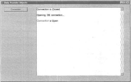 После запуска полученного приложения DataProviderObjects и щелчка на кнопке Connection в текстовом поле появятся строки о закрытии подключения, о состоянии подключения и повторном открытии подключения, как показано на рис. 4.3.