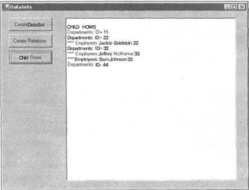 После компоновки проекта DataSetCode и запуска полученного приложения щелкните на кнопке Child ROWS, и в текстовом поле будут выведены значения всех родительских записей из таблицы Employees для каждой родительской записи из таблицы Departments (рис. 5.3).