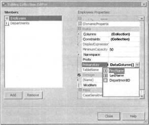 3. В панели свойств Employees Properties выберите свойство PrimaryKey и щелкните на кнопке с изображением стрелки в правой части этого свойства для развертывания списка полей.