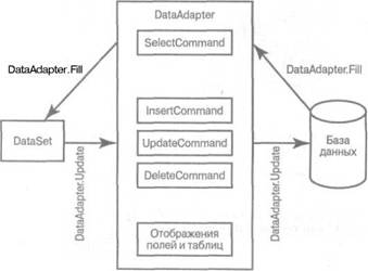 На рис. 6.1 показана схема использования объекта DataAdapter. Основным назначением этого объекта является управление процессом передачи данных от источника данных к объекту DataSet и от объекта DataSet к источнику данных. Это выполняется с помощью небольшого набора свойств и методов, которые описываются далее.