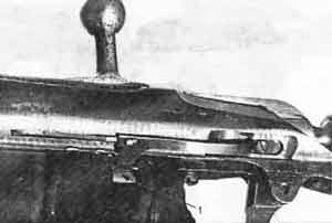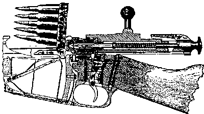 Теперь о тонкостях конструкции, делающих ее предельно надежной. Патроны трехлинейной винтовки имеют шляпку-закраину, которая гарантирует зацепление гильзы выбрасывателем. Кроме того, гильзы такой формы не "затирает" песком в механизме. Но в свою очередь эта закраина при продольном движении патрона по механизму "цепляет" все на своем пути, в том числе и закраины других патронов. У винтовки системы Нагана из-за этого в ствол частенько подавалось сразу по два патрона, что приводило к заклиниванию оружия. Мосин этот недостаток ликвидировал введением в свою конструкцию особой детали - отсечки-отражателя, представляющей собой подпружиненную пластинку с зубом (схема 4, фото 9). Пластинка эта помещается зубом внутрь в прорези ствольной коробки (7 на фото 10). Стебель затвора в поперечном сечении эксцентричен (фото 11). Когда затвор открыт, зуб отсечки-отражателя находится в глубине эксцентрика (7 на фото 11). В таком положении пластина-лопасть выступает из корпуса ствольной коробки и удерживает верхний патрон заполненного магазина от выпадения вверх. В свою очередь отсекающий зуб пружинной части (7 на фото 9) выдвинут в полость магазинной коробки (7 на фото 12) и находится между верхним патроном и теми, которые расположены ниже. Когда верхний патрон выталкивается затвором вперед, зуб пружины удерживает остальные от подачи вверх - он их "отсекает". При повороте затвора вправо эксцентрик стебля (еще раз посмотрите на фото 11) нажимает на зуб лопасти-пластины и "утапливает" ее в паз ствольной коробки, заодно и "утапливая" в сторону зуб пружины, "отсекающий" патроны. Подпружиненные снизу патроны подаются вверх, полость под затвором снова заполняется. После выстрела затвор открывается, отсечка-отражатель снова становится в первоначальное положение. При открытом затворе патрон, поднявшийся из магазина вверх, будет фиксирован снизу отсекающим зубом пружины, сверху - лопастью-пластинкой отсечки-отражателя (схема 5). Он не может двигаться ни вверх, ни вниз. Он разобщен с остальными патронами, и его закраина уже ничто не сможет зацепить при продвижении патрона вперед, в ствол. Отсечка-отражатель выполняет двойную функцию - отсекает патроны от ненужной подачи и отражает стреляную гильзу.
