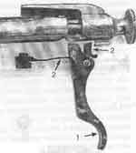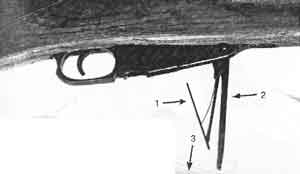 Фото 17. Разборка затвора. Удерживая курок 1, повернуть по часовой стрелке стебель затвора 2. В таком положении курок спущен. Подать вперед боевую личинку 3