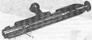 Фото 16. Неполная разборка. Извлечение затвора. При нажатом спуске 1 открытый затвор извлечь по направлению стрелки 2. В ствольной коробке видна лопасть-пластина отсечки-отражателя