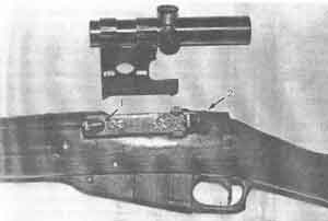 После 1931 года выпускались винтовки только драгунского (слегка укороченного) образца. Система была предельно упрощена: граненая ствольная коробка стала круглой, буковые и ореховые ложа заменили на березовые, а прицельную рамку Коновалова - на секторную. Изменили крепление штыка: раньше оно было с винтовой затяжкой, потом стало с обыкновенной защелкой. Специальную "белую" сталь шептала-пружины заменили на обыкновенную черную. Были и другие упрощения, вследствие чего кучность боя винтовки ухудшилась. Положение не спасло и то, что вместо трех нарезов в канале ствола стали делать четыре. Снайперы с тех пор и до сего времени вынуждены отбирать путем пристрелки особо удачно изготовленные стволы. Кроме того, приходится отлаживать механизм оружия и посадку металлических частей на ложе. При этом обращают внимание на состыковку поверхности опорного выступа ствольной коробки (7 на фото 26) с опорной площадкой нагеля (1 на фото 28). Эти поверхности должны контактировать по всей своей площади. Обратите внимание на "залысины", указанные стрелками 1 на фото 26 и 2 на фото 28. Они означают, что импульс отдачи принимается нагелем сбоку, с одной стороны. Бой такой винтовки не будет точным. Для полного контакта по всей поверхности вышеуказанные детали друг к другу подгоняются надфилем. У собранной винтовки надо "посадить" ствол: при слегка отпущенных соединительных винтах винтовку несколько раз ударить прикладом об пол, после чего винты затянуть. Ствол не должен "болтаться" между ложем и ствольной накладной, для этого его сажают на прокладку-сальник, изготовляемый из хлопчатобумажной байки (стрелка 1 фото 29). Старые мастера терпеливо выбирали пустоты в ствольной накладке и ложе, а ствол сажали на два сальника, между которыми он не касался деревянных частей вообще. Чтобы шомпол не болтался, между ним и ложем ставилась мягкая прокладка (5 на фото 23). Между гребнем затвора и ложем также подклеивалась мягкая фетровая прокладка (стрелка 7 на фото 30). Ничто не должно стучать: лишний стук - это лишнее сотрясение, лишняя степень бокового смещения пули. Старые снайперы стреляли только со штыком дореволюционного выпуска. Такой штык, плотно затянутый на стволе винтом, служил как противовес и сокращал собственные колебания ствола при выстреле. Над регулировкой и отладкой оружия снайперы работали постоянно. Хорошо отлаженная винтовка с отборным стволом и была способна достать цель "между глаз" на расстоянии 800 метров. Это завидная точность даже для современного спортивно-целевого оружия. Для снайперского применения на трехлинейную винтовку ставились оптические прицелы ПУ (фото 31-33), а также прицелы марки ПЕ, ПБ, одинаковые по конструкции, но с разными кронштейнами. На снайперской винтовке рукоятка затвора имеет удлиненную изогнутую форму из-за оптического прицела, находящегося строго над ствольной коробкой. По этой же причине заряжать снайперские винтовки из обоймы нельзя. Магазин приходится наполнять, вкладывая патроны сверху один за другим, просто нажимая патроном вниз. Патрон, "прихваченный" отсечкой-отражателем, вверх уже не выпадет.