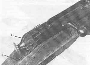Фото 34. Винтовка, поставленная на предохранитель. Курок 1 с силой оттянуть назад, повернуть против часовой стрелки и отпустить. 2 - необходимый зазор