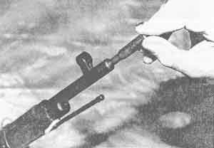 Порядок разборки оружия представлен на фото 13-24. Сборка производится в обратном порядке. При правильной сборке затвора ударник ввинчивается резьбовой частью в курок до тех пор, пока торец резьбовой части не окажется "заподлицо" с затыльной плоскостью курка. Риски на ударнике и курке при этом должны совпадать (фото 25). Самая сложная часть винтовки - затвор. Для его извлечения из винтовки достаточно при нажатом спуске "вытянуть" открытый затвор назад, "к себе". Соединительная планка удерживает воедино все части затвора, извлеченного из винтовки, и является своеобразным "ключом" к его полной разборке. Чашечка-углубление, проточенная в передней части боевой личинки, наезжает на шляпку гильзы при закрывании затвора и служит для его центровки по оси канала ствола. Этим повышается кучность боя. Затвор и подающая пружина с крышкой магазина извлекаются из винтовки при ее чистке после стрельбы и смазки. Это будет неполная разборка. Полностью винтовка разбирается после того, как она побывала в воде, грязи, снегу и ей требуется капитальная чистка. В таком случае все металлические части отделяются от деревянных и винтовка разбирается "до винтика". Ствол, на котором наглухо закреплены основания прицельной планки и мушки, соединен со ствольной коробкой резьбовым соединением наглухо, раз и навсегда, под горячей посадкой. Вывинтить его возможно только в оружейной мастерской. Ствольная коробка представляет собой довольно сложную фрезерованную деталь. На нее крепится спусковой механизм: пружина-шептало с винтом и спусковой крючок с осью, а также отсечка-отражатель, пружина которой посажена в пазу "ласточкин хвост". В нижней передней части ствольная коробка имеет силовой упорный выступ с опорной площадкой (фото 26). В нижней части этого выступа имеется резьбовое отверстие для малого соединительного винта. В хвостовой части ствольной коробки имеется отверстие для большого соединительного винта. Этими двумя винтами ствольная коробка со стволом, накладываемая на ложе сверху, соединяется с магазинной коробкой, вставляемой в ложе снизу. Вышеназванные винты в завернутом состоянии "стягивают" через ложе эти металлические части друг с другом, образуя "посадку" оружия. Ствол в передней части притягивается к ложу через деревянную ствольную накладку двумя ложевыми кольцами. Магазинная коробка - штампованно-сварной конструкции (фото 27) с подавателем, который может быть легко открыт при необходимости извлечь нерасстрелянные патроны.