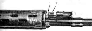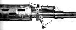 при снятом прицеле повернуть по часовой стрелке до отказа замыкатель крышки ствольной коробки 1 и поставить его на фиксатор
