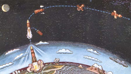 Представим себе орбиту в виде проволочного кольца. Натянем на него мысленно тонкую плёночку. Как бабушка натягивает на пяльцы платочек. Эта воображаемая плёночка называется «плоскость орбиты». Она обязательно должна проходить через центр земного шара. Поэтому спутники Земли не могут летать как угодно, по любым кругам. Не могут, скажем, кружить над полюсом. Или над какой-нибудь одной страной. Их орбита должна опоясывать земной шар по самому широкому месту. Как бы разрезая его своей плоскостью на две равные половинки.