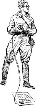 Это немолодой мужчина в зеленоватом комбинезоне «на молниях», с большими четырехугольными карманами. На ногах брезентовые защитного цвета сапоги. Через плечо - большая сумка. Человек этот в темных очках и без фуражки. В левой руке у незнакомца кусок картона с пришпиленным к нему листом бумаги, в правой зажаты, кажется, часы. У пояса какой-то инструмент в брезентовом чехле.