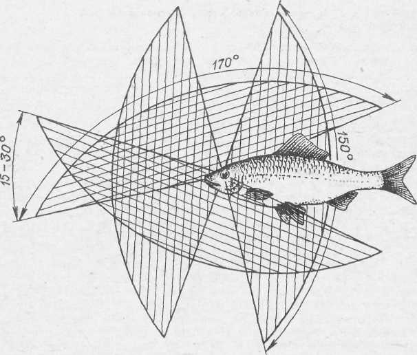 Зрение у большинства пресноводных рыб является основным органом чувств, посредством которого они отыскивают и распознают пищу. Но рыбы близоруки и в прозрачной воде видят не далее 12–15 м, а четко различают предметы на расстоянии до 1,5 м, причем каждый глаз видит самостоятельно, так что поле зрения у них большое. Достаточно сказать, что угол зрения рыб по горизонтали составляет около 170°, а по вертикали — до 150°. По последним данным, углы зрения рыб накладываются один на другой, и это позволяет им видеть перед собой бинокулярно, значит, они могут точно определять расстояние до увиденного предмета (рис. 1).
