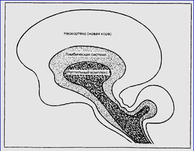 Рис. 7. Чрезвычайно схематическое изображение рептильного комплекса, лимбической системы и новой коры головного мозга человека (по Мак-Лину)
