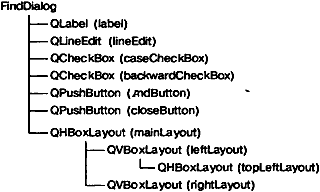 На этом завершается рассмотрение конструктора FindDialog. Поскольку нами использован оператор new при создании виджетов и менеджеров компоновки, нам, по-видимому, придется написать деструктор, где будут предусмотрены операторы delete для удаления каждого созданного нами виджета и менеджера компоновки. Но поступать так не обязательно, поскольку Qt автоматически удаляет дочерние объекты при разрушении родительского объекта, а все дочерние виджеты и менеджеры компоновки являются потомками FindDialog.