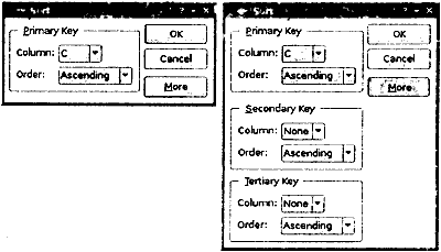 Данное диалоговое окно является окном сортировки в приложении Электронная таблица, позволяющим пользователю задавать один или несколько столбцов сортировки. В обычном представлении этого окна пользователь может ввести один ключ сортировки, а в расширенном представлении он может ввести дополнительно еще два ключа сортировки. Кнопка More (больше) позволяет пользователю переключаться с обычного представления на расширенное и наоборот.