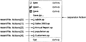 Затем мы снова проходим по списку файла, на этот раз пользуясь индексацией массива. Для каждого файла мы создаем строку из амперсанда, номера файла (j + 1), пробела и имени файла (без пути). Для соответствующего пункта меню мы задаем этот текст. Например, если первым был файл С:\My Documents\tab04.sp, пункт меню первого недавно используемого файла будет иметь текст «&1 tab04.sp».