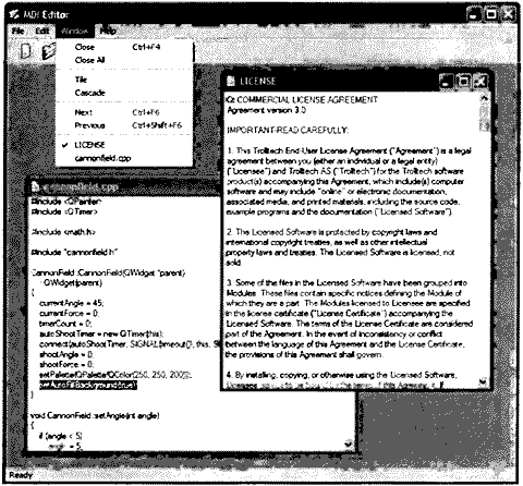Приложения, которые обеспечивают работу со многими документами в центральной области главного окна, называются приложениями с многодокументным интерфейсом или MDI—приложениями. В Qt MDI—приложения создаются с использованием в качестве центрального виджета класса QWorkspace и путем представления каждого документа в виде дочернего окна QWorkspace.