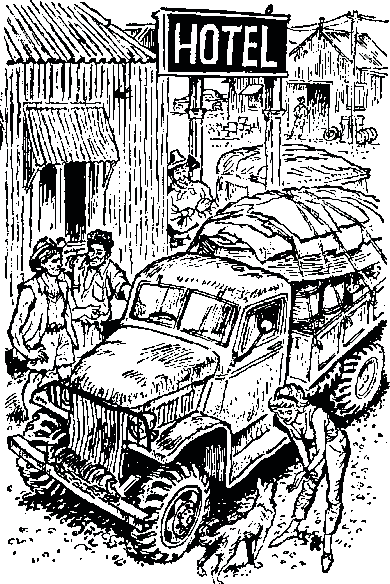 В тот день, когда мы встретили Дарси, он отправлялся на реку Николсон и сказал, чтобы мы следовали за ним. Ехать предстояло миль восемьдесят. Дарси оставалось только покинуть бар, сесть в кабину грузовика и тронуться в путь. Он уже погрузил бочки с бензином, мешки с солью и продуктами, но все еще слонялся с места на место, пока я не стал приходить в бешенство. То, что он не хвастался охотничьими подвигами и не очень стремился в путь, действовало на меня как-то успокаивающе, и я уже начинал проникаться к нему доверием. Нет, хвастуном он не был. Но мы так долго предвкушали этот час, столько проделали миль и столько наслышались рассказов, что сдерживать нетерпение было трудно. Когда он наконец завел свой «блиц» и поехал по проселочной дороге, я не стал задерживаться ни на секунду. Мы следовали за ним в огромном плюмаже пыли под самым задним бортом его дребезжащего грузовика.