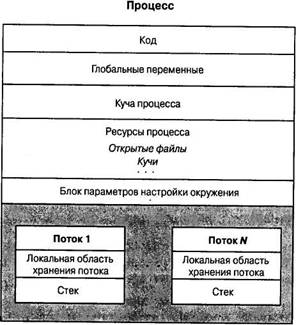На рис. 6.1 показан процесс с несколькими потоками. Рисунок является схематическим, поэтому на нем не указаны фактические адреса памяти и не соблюдены масштабы.