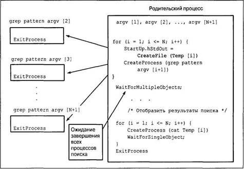 Настало время посмотреть на процессы Windows в действии. Приведенная ниже в качестве примера программа grepMP создает процессы для поиска указанного текстового шаблона в файлах, по одному процессу на каждый файл. Эта программа моделирует UNIX-утилиту grep, хотя используемая нами методика применима к любой программе, которая полагается на стандартный вывод. Рассматривайте программу поиска как "черный ящик" и считайте, что она является просто исполняемой программой, выполнение которой должно контролироваться родительским процессом.