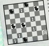 Задание. Вы играете утятами, а ваш противник — зайчатами. Следующим ходом один из зайчиков противника дойдет до восьмой линии и превратиться в игуанодона. От вас требуется в три хода загнать игуанодона в угол и столкнуть его с доски.
