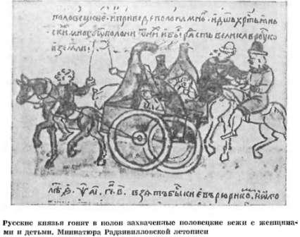 В летописи после победы над половцами 1103 г. говорится, что Владимир «скруши главы змеевыя» (ПСРЛ, II, с. 255). Именно так, видимо, появился в былинах Змеевич. Змеи проникли в русский фольклор значительно шире. Определенный «пласт» русских сказок буквально заполнен трех-, семи- и двенадцатиглавыми Змеями или Змеями Горыпичами, лютыми врагами русских богатырей. Обычно «Змеи» подходят к пограничной реке Снепороду (в летописях Снепородом называется Самара). Мы знаем, что на Самаре вполне могли встречаться русские полки, углубившиеся в степь, но на самом деле эта река не была пограничной. Пограничной была Сула, и именно к ней из года в год подходили половецкие орды, грабя окрестности пограничных крепостиц, форсируя реку и прорываясь на земли Переяславского княжества. Самое название реки Сула происходит от тюркского «sulaq», что означает «полноводный» (Менгес, 1979, с. 131). На русско-половецком пограничье, да и во всех русских южных городах половецкий язык был общеизвестным. Поэтому тюркские названия рек, небольших городков, урочищ легко воспринимались русским населением. Впрочем, как мы видели, разноплановое общение с половцами способствовало проникновению не только отдельных слов и понятий в древнерусский язык, но и целых образов в древнерусский фольклор и даже в письменную культуру. Взаимодействие двух формирующихся народов происходило и в последующее столетие, поэтому мы неоднократно будем возвращаться к этому вопросу ниже. Здесь же упомянем еще об одном половецком образе, проникшем в русский эпос именно в рассмотренный нами в данной главе период. Это образ «поляницы», т. е. женщины-богатырши. Хорошо известно, что в эпоху средневековья во всех европейских государствах положение женщины было чудовищно тяжелым. Христианская религия (как и мусульманская) способствовали этому. Женщина была, по их учениям, грязным «сосудом греха». Времена княгини Ольги — правительницы молодого Русского государства и опекунши своего сына и своих внуков — давно прошли и были забыты христианолюбивым народом. Не могло быть речи в XI в. о каких-то «поляшщах» ~ русских девушках. Это, несомненно, были молодые половчанки. Характерно, что былинный Добрыня Никитич встретил «поляшщу» в «чистом поле», т. е., видимо, в степи, сидящей на добром коне. Победив Добрыню, «поляница» сунула его в кожаный мешок, притороченный к седлу. Это тоже несомненно кочевнический образ, тем более что девушка не ранила Добрыню, а «сдернула» его с седла, что также является типичным приемом кочевников. В былине «поляница» названа дочерью короля «ляховецко-го» Настасьей Никуличной, однако следует помнить, что имя половцев уже давно стерлось из памяти народной, женские тюркские имена не были распространены на Руси и не попали в эпос. Добрыня, после того как был извлечен из комканого мешка под угрозой позорной смерти («на долонь кладу, другой ,прижму и в овсяный блин да его сделаю»), согласился жениться на «полянице», и когда привез ее в Киев, то прежде всего девушку «привели в верушку крещеную». Таким образом, она прошла обычный путь девушки-половчанки, взятой из степи замуж за русского князя или простого воина: ее прежде надо было окрестить (дать ей христианское имя), а потом уже вести под венец. Свадебные обряды в степи включали в себя и единоборство жениха с невестой (Липец, 1983). Поэтому можно дума