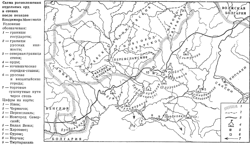 Первые объединения были рыхлыми, часто распадались, вновь образовывались в новом составе и на другой территории. Эти обстоятельства не дают нам возможности точно определить местонахождение владений каждого великого хана и тем более каждой орды. Относительная стабилизация, вернее, определенность сложилась в степях позднее — во второй половине XII в. Однако для того чтобы последовательно рассмотреть этот период, необходимо вернуться к судьбам печенего-торческих орд, оставшихся в степях после прихода в них половцев, поскольку они играли весьма активную роль в жизни как степных кочевников, так и населения южных русских княжеств.