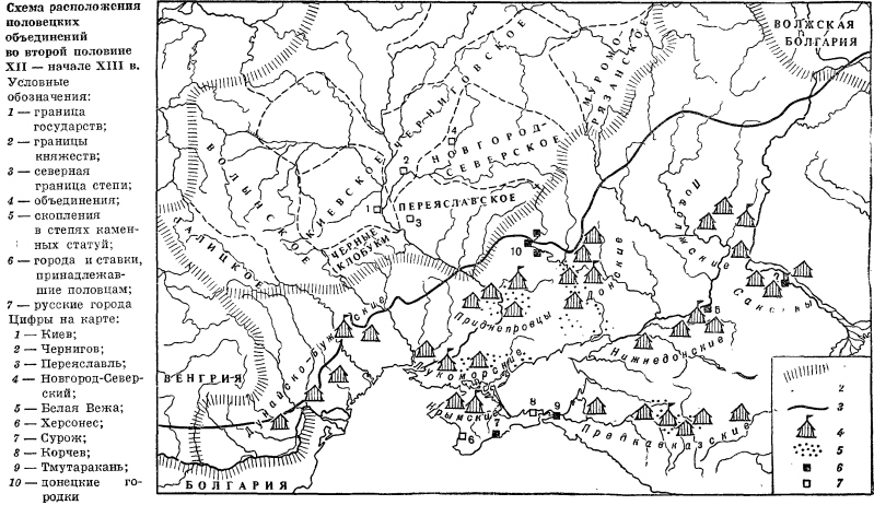 В записи 1172 г. летописец говорит о делении половцев, во всяком случае, на две крупные группировки. Он сообщает, что в первый год княжения в Киеве Глеба «приде множьство половецк, разделившихся надвое, одни поидоша к Переяславлю и сташа у Песочна, а друзия поидоша ло оной стороне Днепра Кыеву и сташа у Кор-суня (Днепровского.— С. II.)» (ПСРЛ, II, с. 555). Половцы пришли просить мира, и Глеб поспешил им навстречу. Но сначала он направился к половцам, ставшим под Пе-реяславлем, поскольку переяславскому князю Владимиру Глебовичу было всего 12 лет и он, конечно, нуждался в помощи во время переговоров. Однако он не забыл послать половцам, стоявшим у Корсуня, весть: «...умиряся с тыми половци и приду к вам на мир». Однако «корсун-ские» половцы, узнав, что Глеб поехал в Переяславль, отказались от похвального намерения заключить мир я ринулись к Киеву за полоном: «...взяша села без учета, с людми и с мужи и с женами, и коне и скоти и овьце погнаша в половьце». Однако увести в степь этот богатый полон они но успели, так как были настигнуты братом Глеба — Михалко с сотней переяславцев и 1500 берендеями и «усретоша половце идуще с полоном и бив-шася и одолети их, самих избиша, а полон свой отъима-ша». Интересно сообщение об этой битве потому, что летописец, подводя итоги, писал далее: «...бысть сеча зла... Якоже преже в луце моря бьяхуся с ними крепко» (ПСРЛ, II, с. 556—559). Почему неожиданно вспоминает он Лукоморье? Видимо, потому, что в 1172 г. под Киевом действовали те же лукоморские половцы. Как и в 1103 г., они были побеждены, частично перебиты, частью взяты в плен. Только «князь их Тоглий утече».