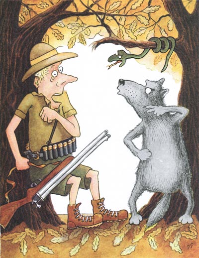 Другой трусливый охотник однажды перед охотой подкрепился двумя булочками, стаканом кефира, но струсил и так ослабел, что решил на охоту не идти. Подкрепившись еще тремя булочками и двумя стаканами кефира, он осмелел, даже зарядил ружье, но снова струсил. Пришлось ему опять восстанавливать свои силы тремя стаканами кефира и двумя булочками. После этого он так расхрабрился, что пошел на охоту, но в лесу почувствовал сильную дрожь и убежал домой.