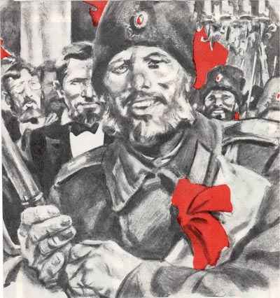 По улице и площади перед вокзалом, как-то крадучись, пробегали редкие пешеходы. Вдруг, нарушив настороженную тишину пустынной улицы, показался зелёный грузовой автомобиль, наполненный стоящими в нём людьми в шапках, чёрных куртках, с ружьями и пулемётными лентами. Двое передних держали ружья на прицел, целясь во что-то невидимое впереди. Публика, давя друг друга, бросилась в вокзал. И опять где-то посыпалась картошка на доски. И вдогонку первому пролетел другой автомобиль с серыми шинелями солдат. Потом внезапно остановился, и солдаты, выпрыгнув, спрятались за него и стали стрелять куда-то вперёд по улице, высовываясь и опять прячась.