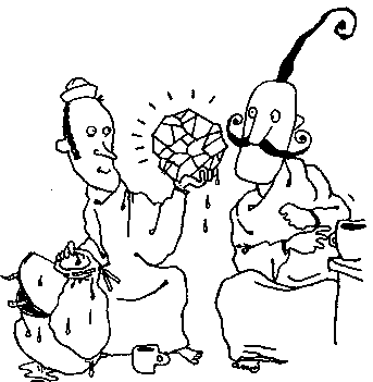 Курт достает из торбы алмаз и кладет его перед ювелиром. Алмаз хорош — глаз не отвести, и переливается. Ювелир хватается за голову. Вскрикивает. И падает без чувств. Курт бегом приносит стакан воды и выливает на ювелира. Так он бегает несколько раз, пока наконец ювелир не приходит в себя. Он встает и принимается ходить кругами вокруг алмаза, хлопая в ладоши. Потом он некоторое время разглядывает алмаз в большую трубочку и дышит, как паровоз.