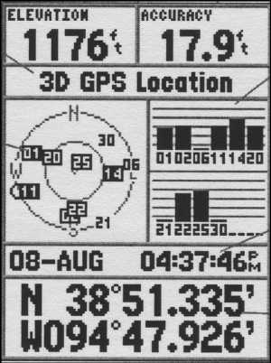 На информационной странице GPS на полях данных отображаются высота над уровнем моря, оценочная точность определения места, дата и время (местное или по Гринвичу), текущие координаты позиции. В двух полях отображается расположение спутников и уровни принимаемых сигналов.