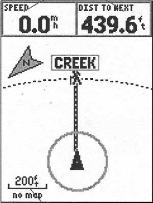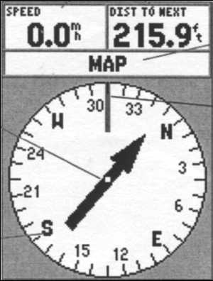 Эта страница используется для движения к заданным путевым или маршрутным точкам, обычно в случаях, когда движение строго по прямой невозможно. На ней находятся (рис. 53) поле данных (которое может убираться или изменяться) и поле компаса. Кроме того, без наличия активной путевой точки, она может использоваться как обычный компас для контроля направления движения.