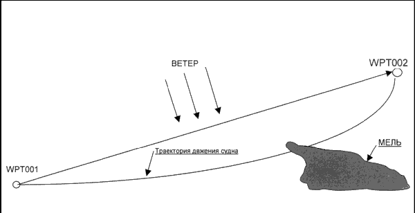 Этот способ навигации очень удобен на открытом пространстве. В местах, где имеются навигационные опасности – мели, камни, затонувшие суда – плавание по «компасу» может привести к аварии. Дело в том, что при плавании судно отклоняется от курса из-за воздействия на него ветра, течений, волн, из-за неточного управления. Так, например, при постоянном боковом ветре с правого борта судно будет сваливаться влево от первоначального курса и, удерживаемая рулевым по стрелке по направлению к путевой точке, будет двигаться по дуге (рис. 58). В этом случае, если рядом с проложенным курсом есть какие либо подводные опасности, то такое отклонение может привести к неприятным последствиям.