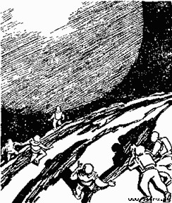 Проверив крепления, космонавты огляделись. Они стояли на бугристой каменной глыбе, холодной и неуютной, хотя и залитой солнечным светом, не менее ярким, чем на Земле. Несмотря на то что Фобос находится значительно дальше от Солнца, свет был очень сильный — отсутствовала атмосфера, способная поглощать его или рассеивать. Лишенную гор местность нельзя было назвать и равниной. Сферическая в общем форма Фобоса легко воспринималась глазом, как будто человек стоял на вершине холма с пологими склонами. Линия горизонта лежала совсем близко. Там, где кончалась доступная взору светло-серая, местами красноватая поверхность планетки, начиналась пугающая чернота пространства.