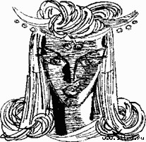 Одной ступенькой ниже на таком же троне сидела женщина. Удлиненный овал ее черного лица служил как бы рамкой Для главного — огромных, необычайно выразительных темно-синих глаз. Они были миндалевидной формы, чуть-чуть раскосые, как у женщин с острова Явы, и удивительных по цвету. Это был чистый и глубокий синий цвет, живой и прозрачный, как небо коротких южных сумерек, когда солнце уже село, но еще не наступила ночная тьма. Нос был прямой и тонкий, словно изваянный из черного мрамора. Рот маленький, губы тухлые и очень темные, как черные пионы. На голове ее был обруч такой же двурогой, как у Иргана, короны, но только не золотой, а серебряный. Из-под него по обе стороны лица струился целый водопад длинных черных с красным отливом волос, падающих на плечи черными волнами, опускающимися до пояса по серебряной ткани одежды. Синий плащ, отделанный белым мехом, дополнял ее наряд.