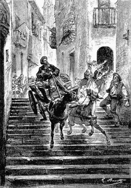 Крики вдвое усилились, к ним присоединился собачий лай. Безрассудные мулы упорно рвались вперед. Колеса застучали по ступенькам, кузов затрясло так, что экипаж в любое мгновение мог развалиться на куски. Но все обошлось. Несмотря на частые толчки, передняя часть повозки не отделилась от задней, оглобли не поломались, а руки Кловиса Дардантора не выпустили вожжей во время такого из ряда вон выходящего спуска.