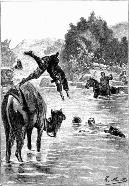 Когда прошли уже более половины расстояния до противоположного берега, послышался крик. Его издала Луиза, увидев, что Жан исчез, а ноги у его лошади скрылись под водой. Дело в том, что справа от брода образовалась впадина глубиной пять-шесть метров, которую можно было бы обойти, если бы проводник держался чуть выше по течению. Впрочем, с Жаном, хорошим пловцом, не случилось бы ничего страшного, высвободи он вовремя ноги из стремян. Но молодой человек столь стремительно выскочил из седла неожиданно оступившегося коня, что сделать этого не успел.