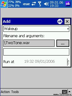 Опция Notify Queue обычно используется для решения проблемы, появляющейся после некорректного удаления программ, и проявляющейся в появлении сообщения «Не могу выполнить xxxxx.exe» после включения КПК или помещения его в кредл. Но, имеется возможность некоторого дополнительного «тюнинга» системы, например, добавление звукового сопровождения включения КПК. Выберите action->add, в комбо-боксе — wakeup, ниже звуковой файл. Нажмите ОК.
