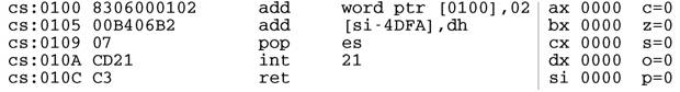 Однако, на «обычные» отладчики управа всегда найдется (см. соответствующую главу), а с эмуляционными справиться гораздо труднее, и приведенный пример один из немногих, способных возыметь действие на виртуальный процессор.