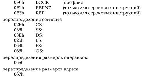 Обратим внимание так же и на последовательности типа 0x66 0x66 [xxx]. Хотя фирма intel не гарантирует корректную работу своих процессоров в такой ситуации, но фактически все они правильно интерпретируют такую ситуацию. Иное дело некоторые отладчики и дизассемблеры, которые спотыкаются и начинают некорректно вести себя.