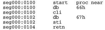 Префикс переопределения размера операндов используется в 16-разрядном режиме для манипуляции с 32-битными операндами и наоборот. При этом он может стоять перед любой командой, например x66:CLIбудет работать! А почему бы и нет? Интересно, но отладчики этого не учитывают и отказываются работать. То же относиться и к дизассемблерам, к примеру IDA Pro: