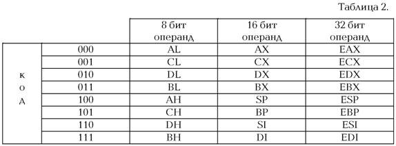 К тонкостям кодирования команд мы еще вернемся, а пока приготовимся к разбору поля modR/M. Два трехбитовых поля могут задавать код регистра общего назначения по следующей таблице (таблица 2):