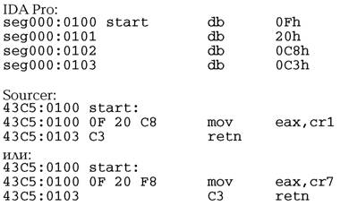 Все эти команды на самом деле не существуют и приводят к вызову прерывания INT06h. Не так очевидно, правда? И еще менее очевидно обращение к регистрам DR4-DR5. При обращении к ним исключения не генерируется. Между прочим, IDA Pro 3.84 дизассемблирует не все регистры. Зато великолепно их ассемблирует (кстати, ассемблер этот был добавлен другим разработчиком).
